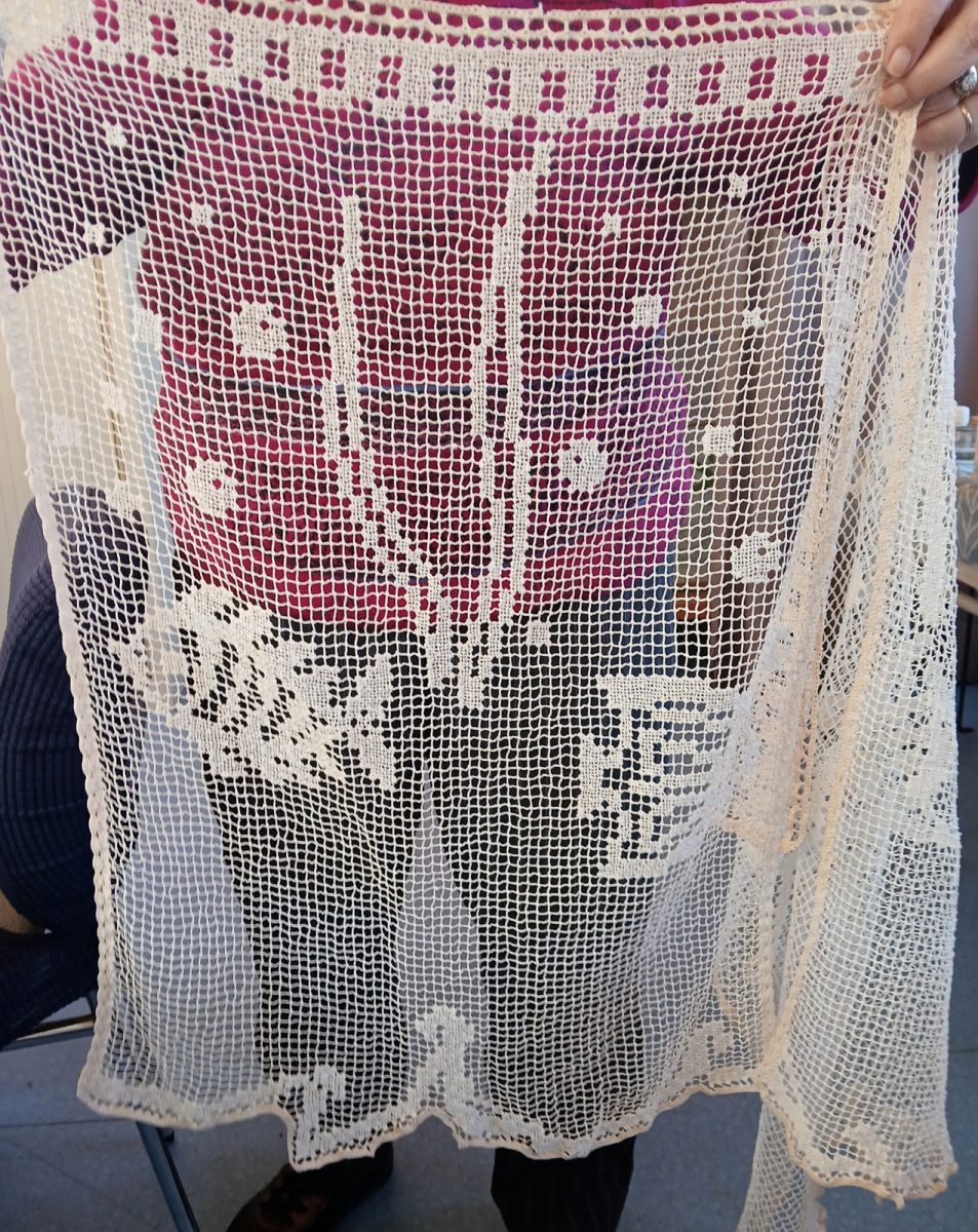 Marie Thérèse nous présente une paire de rideaux sur laquelle elle a réalisé une « Broderie sur filet « .
