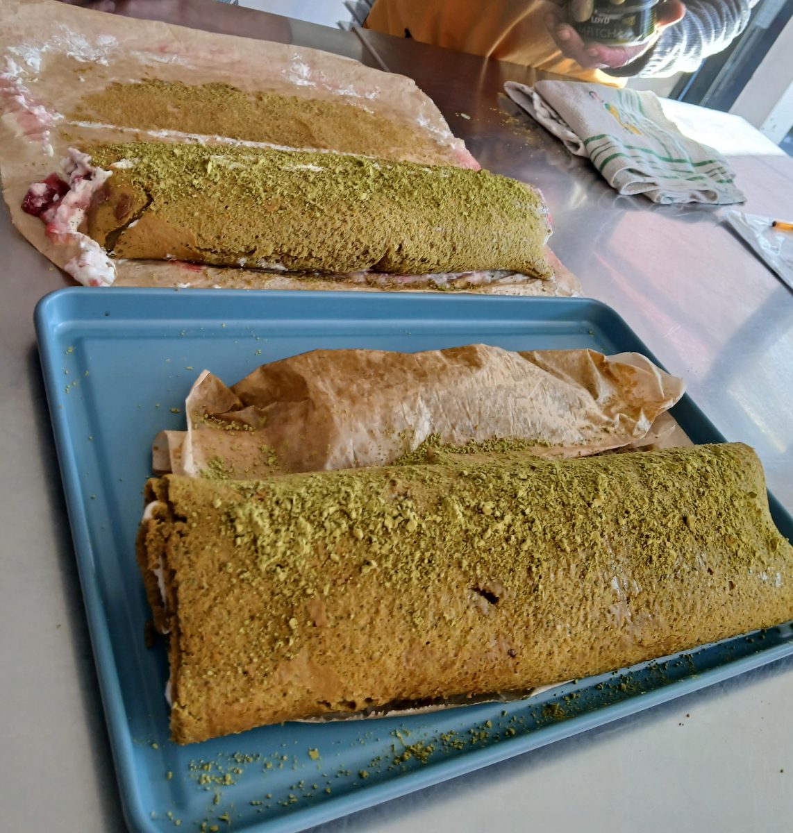 « Gâteaux roulés saupoudrés de thé matcha et sucre glace ».