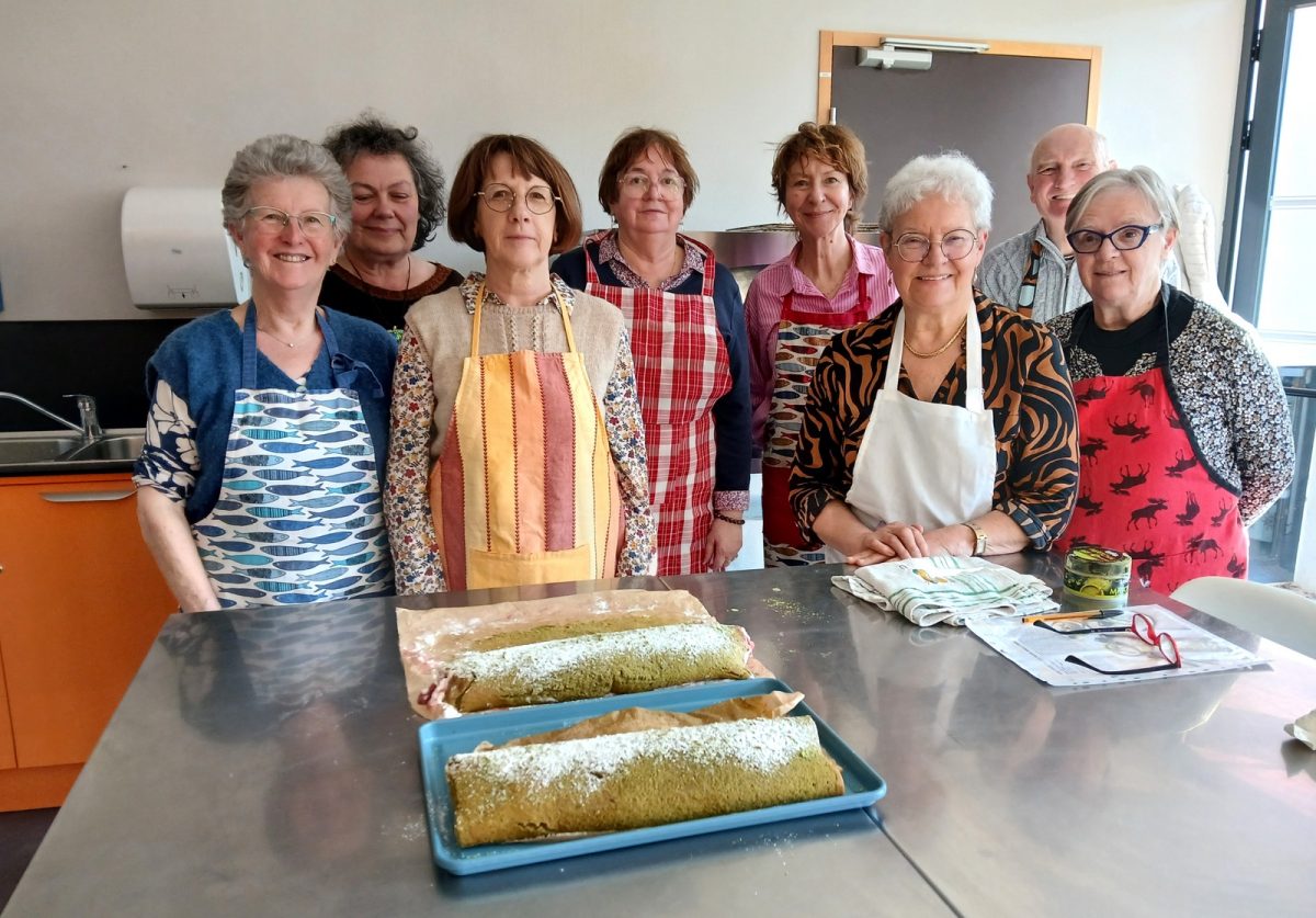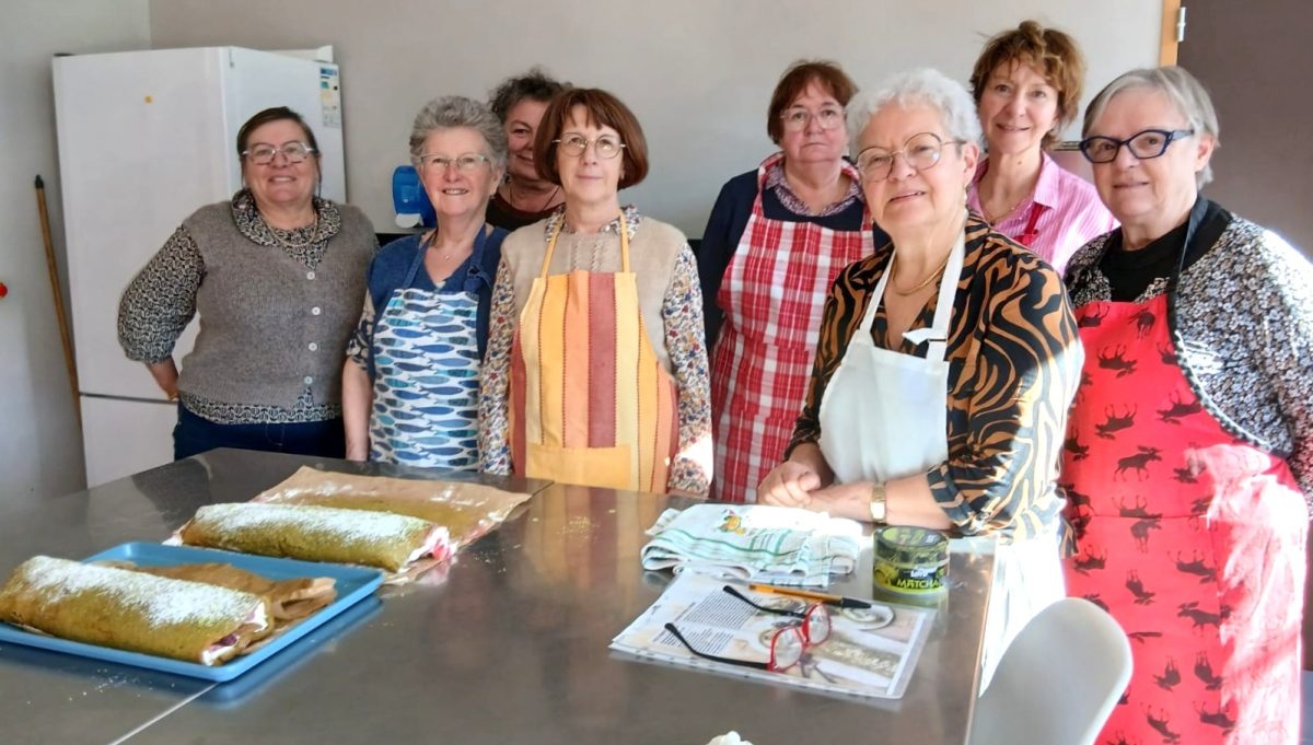 Murielle roule le biscuit avec la préparation crémeuse garnie de fraises.